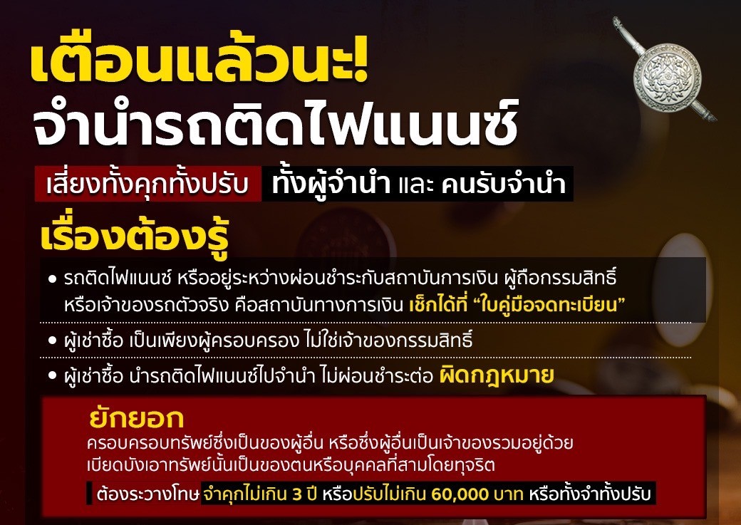ตร. เตือน จำนำรถติดไฟแนนซ์ ผิดกฎหมาย! คนรับจำนำ หรือซื้อรถหลุดจำนำ เสี่ยงผิด “รับของโจร” เมื่อวันที่