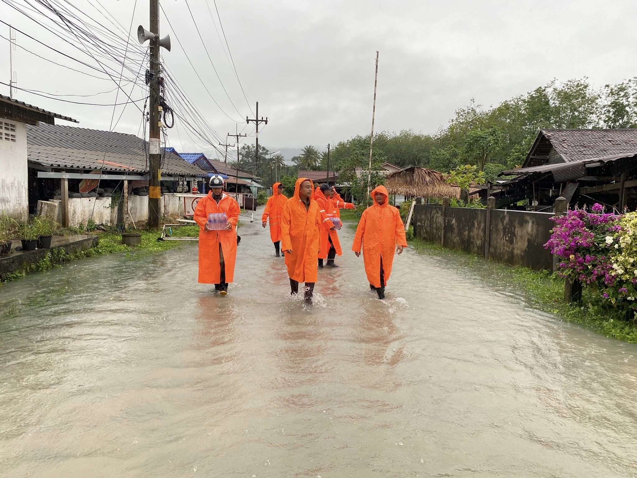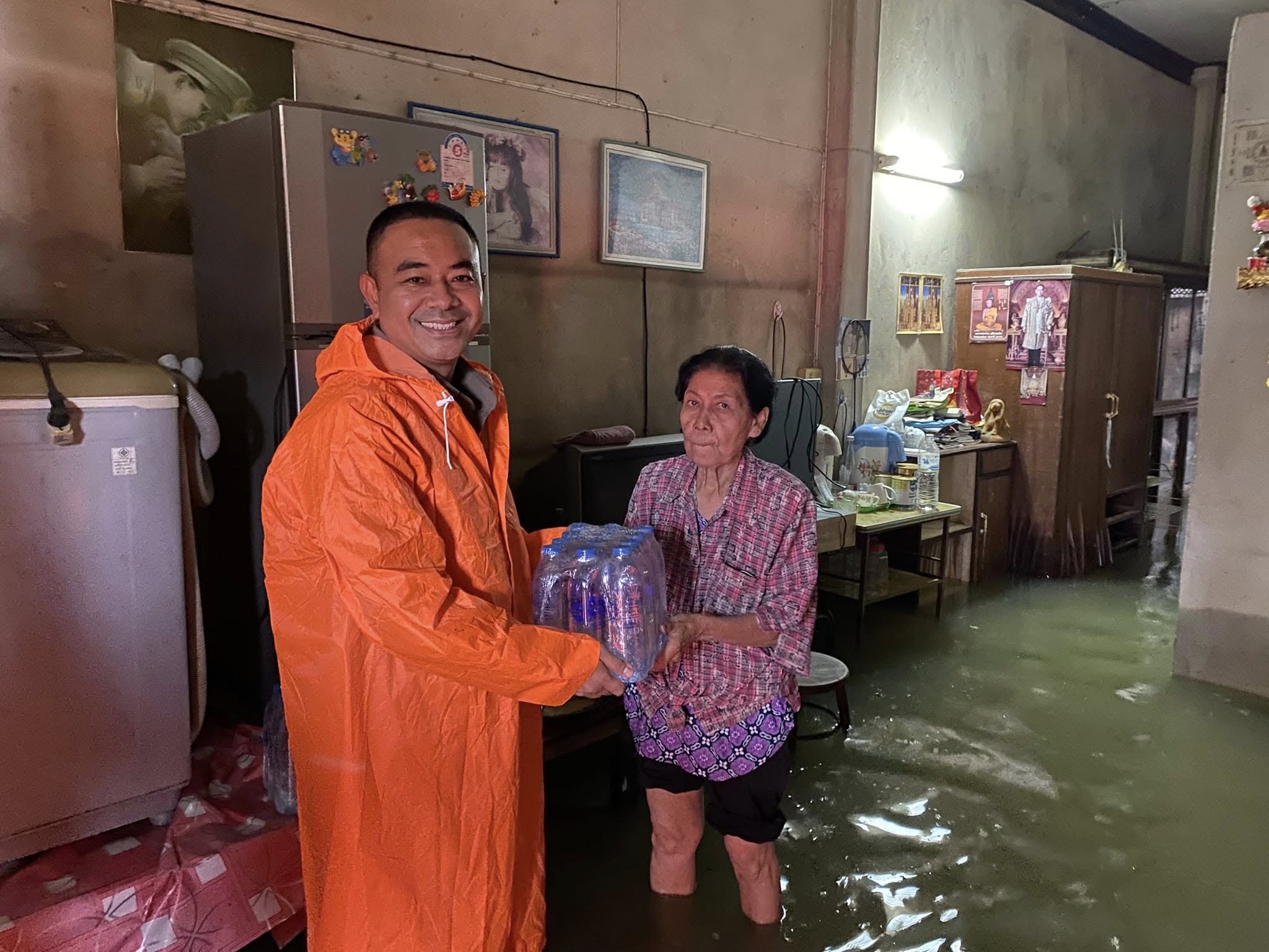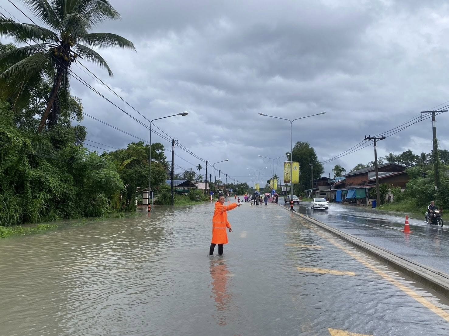 ข้าราชการตำรวจจิตอาสาจราจรบนถนนสาย 409 น้ำท่วมขังช่องทางการจราจร ใช้ได้ 1 ช่องทาง (ให้รถวิ่งสวนกันได