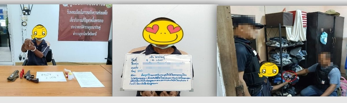 “มีอาวุธปืนและเครื่องกระสุนปืนไว้ในครอบครองโดยไม่ได้รับอนุญาตฯ , มียาเสพติดให้โทษประเภท ๑ (ยาบ้า) ไว้ในครอบครองเพื่อเสพ โดยฝ่าฝืนต่อกฎหมาย , เสพยาเสพติดให้โทษประเภท ๑ (ยาบ้า) โดยฝ่าฝืนต่อกฎหมาย” พร้อมด้วยของกลางดังนี้