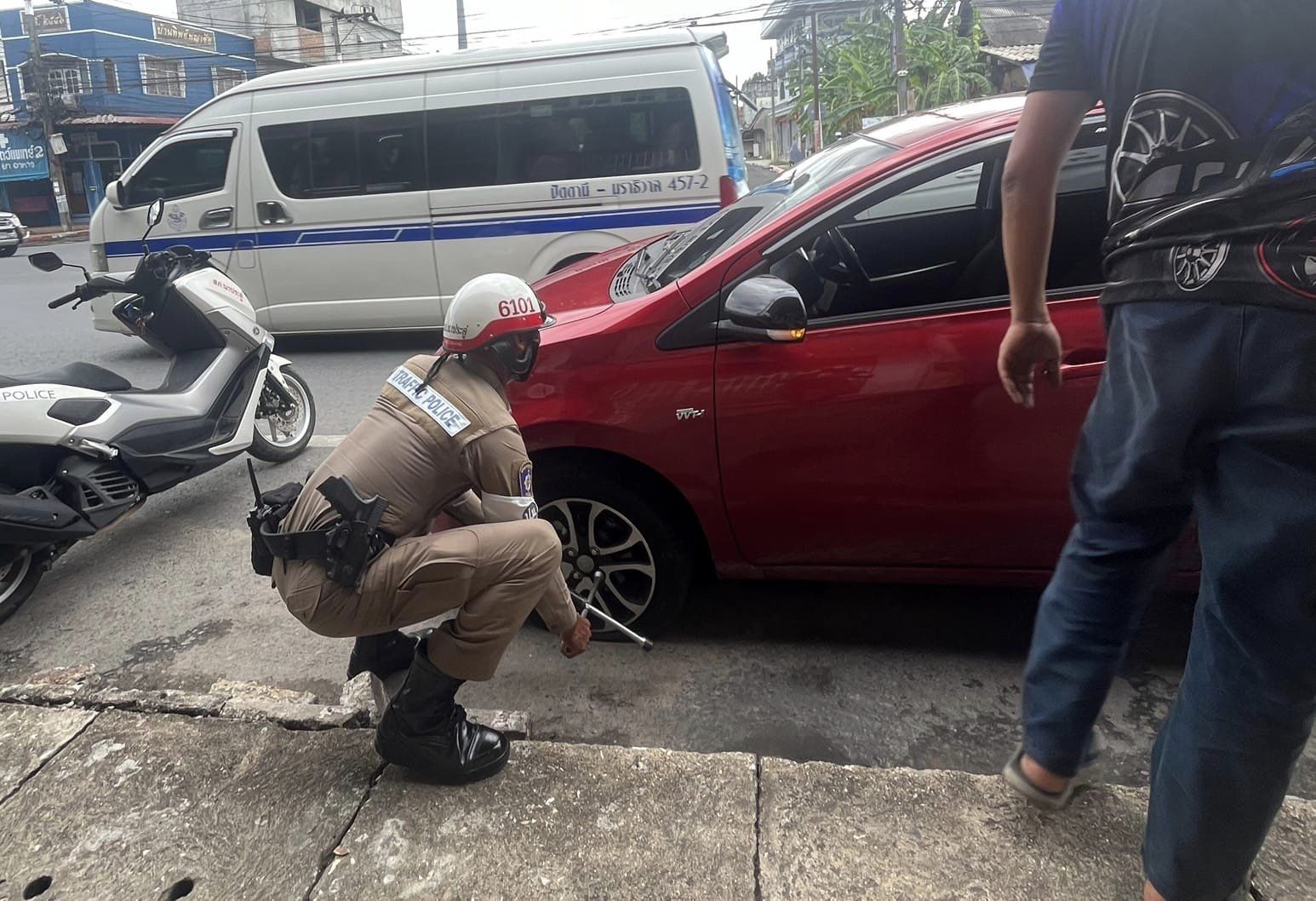 วันที่ 11 เม.ย. 2567 จราจร สภ.นาประดู่ ให้การช่วยเหลือประชาชน รถยางรั่ว บริเวณแยกไฟแดงเทศบาลตำบลนาปร